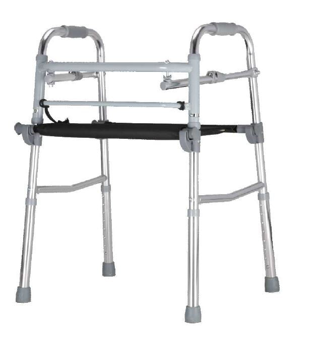 Cadru de mers cu sezut, realizat din aluminiu anodizat. Cadrul de mers este pliabil, se reduce volumul la transport sau depozitare.
