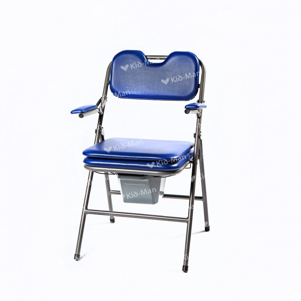Scaun WC de camera, pliabil, destinat a fi utilizat de persoanele cu probleme de mobilitate sau, in alte cazuri, exista limitari de a folosi toaleta obisnuita. Cadrul este realizat din otel vopsit.