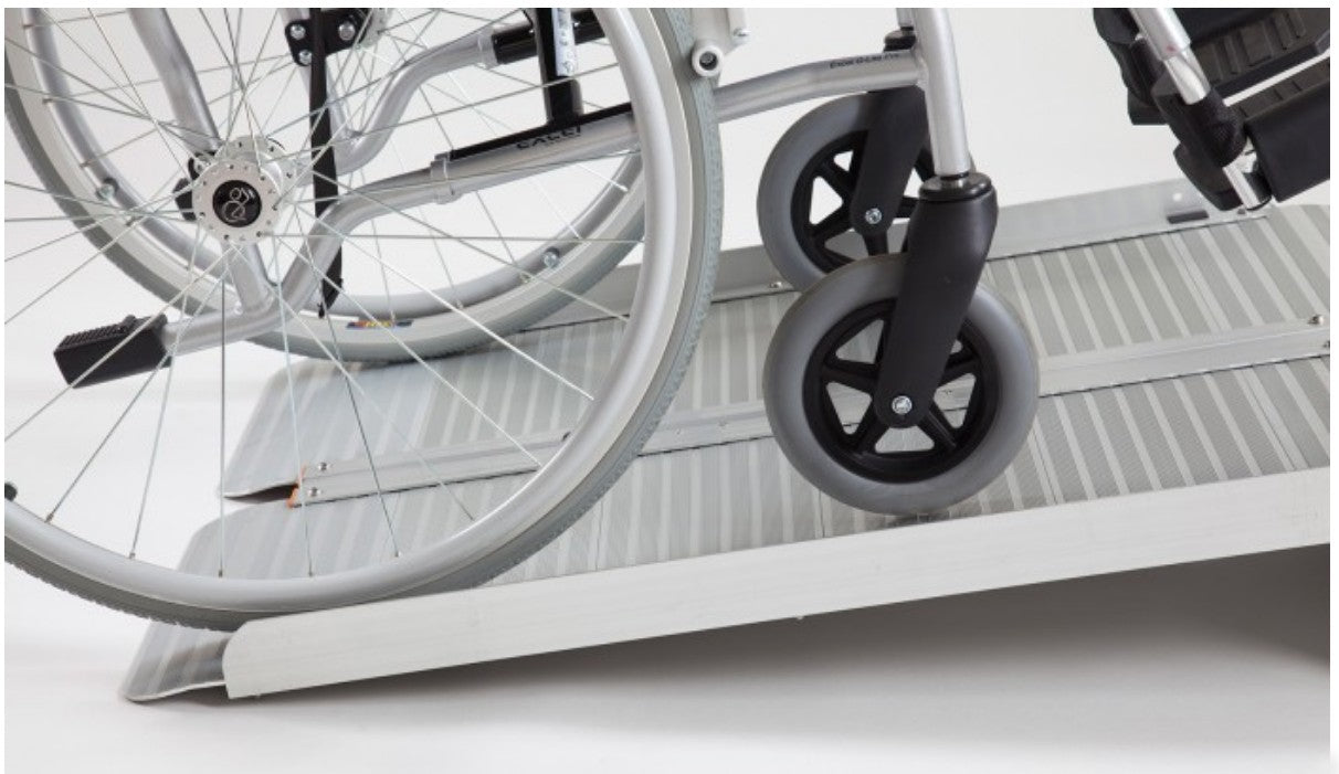 Rampa din aluminium pentru scaun cu rotile, utilizata pentru depasirea obstacolelor. Rampa pentru persoane cu dizabilitati este realizata din doua componente, cate una pentru fiecare cale de rulare.