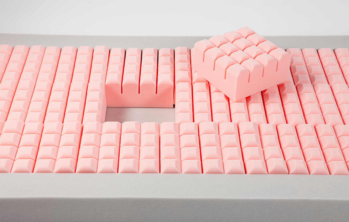 Salteaua antiescare a fost realizata din spumă de densitate ridicată, elastică. O parte dintre componentele acesteia se pot detasa. Aceasta proprietate permite adaptarea individuala a saltelei antiescare, prin îndepărtarea segmentelor (cuburilor).