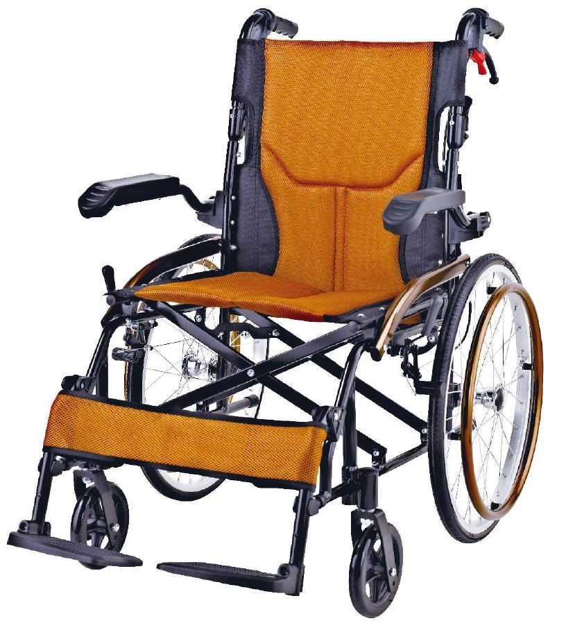 Scaun cu rotile cu greutate redusa. Scaunul cu rotile este realizat din aluminiu, este pliabil, sistemul de pliere este tip "dubla foarfeca", se obtine stabilitate marita in utilizare.